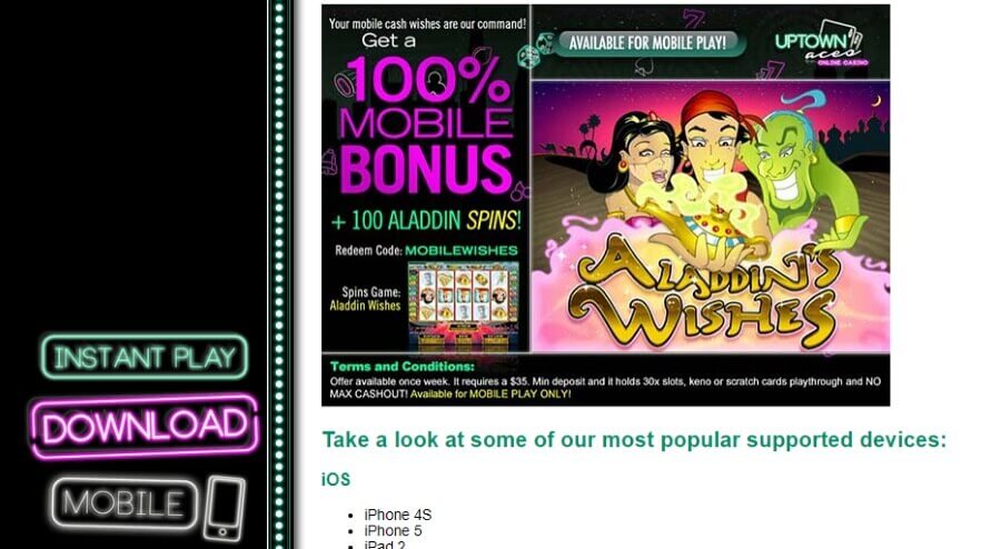 The Uptown Aces live casino has a good selection of optimized games that can be played using any iOS or Android device. RealTime Gaming (RGT) casino games work really well on a smartphone or tablet. Just a few clicks of the buttons and you can play a wide selection of the games anytime and anywhere you want to. The Uptown Aces mobile casino site is very safe and secure and even has a few special offers. There’s a special redeem mobile weekly code “MOBILEWISHES” that gives you the chance to play with a 100% match + 100 free spins once every week.